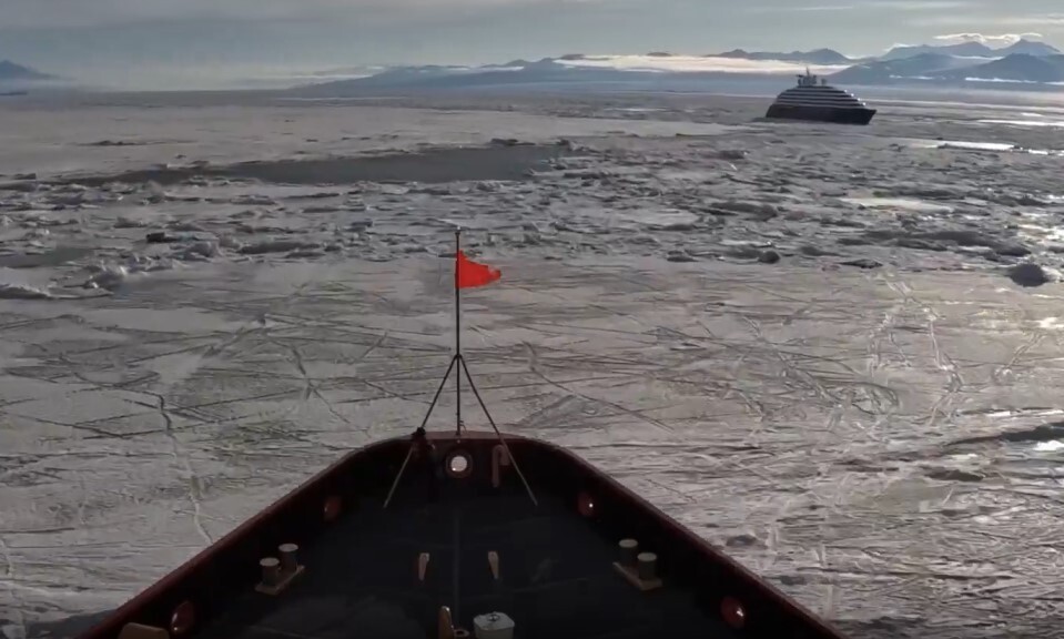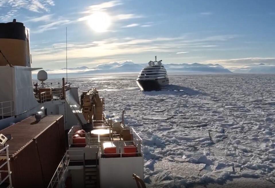 영상을 보면 쇄빙선이 도착하자 크루즈 손님들은 샴페인을 들고 갑판으로 나와 50년 된 미국 해안경비대 함정이 얼음을 깨고 접근하는 모습을 지켜보았다.