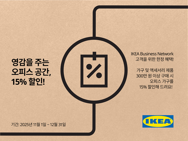 행사 기간 이케아의 비즈니스 고객 대상 무료 멤버십 프로그램인 ‘이케아 비즈니스 네트워크’ 멤버가 비즈니스 구매 상담 또는 비즈니스 스타일링 서비스를 이용해 책상과 의자를 포함한 홈퍼니싱 제품을 300만원 이상 구매하면 책상, 의자 결제액 15% 할인 혜택을 제공한다.