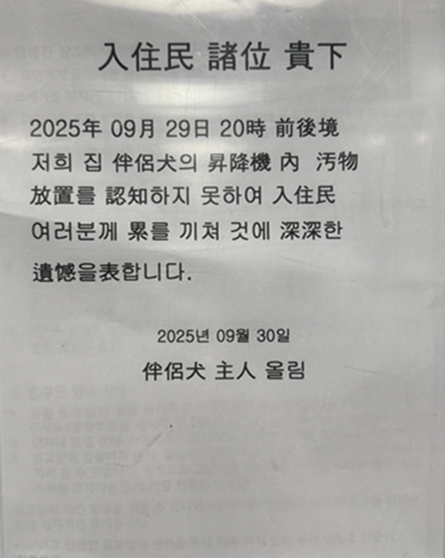 한자와 한글이 섞인 사과문에는 “입주민 여러분 귀하. 2025년 9월 29일 20시 전후경 반려견 승강기 내 오물 방치 인지하지 못하여 입주민 여러분께 누를 끼친 것에 심심한 유감을 표합니다. 반려견 주인 올림”이라는 내용이 적혀 있었다.